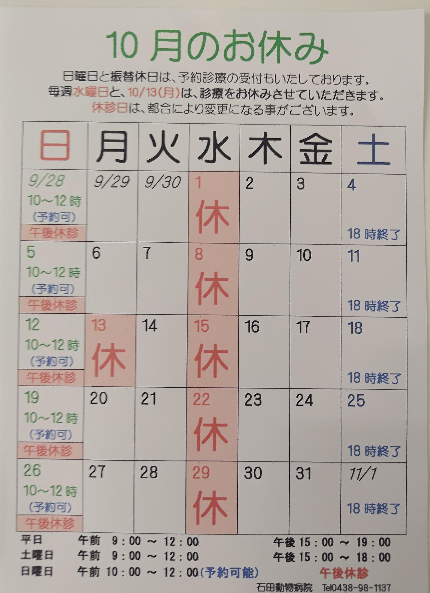 10月は休診日である毎週水曜日のほかに13日(月)がスポーツの日で休診日となっています。