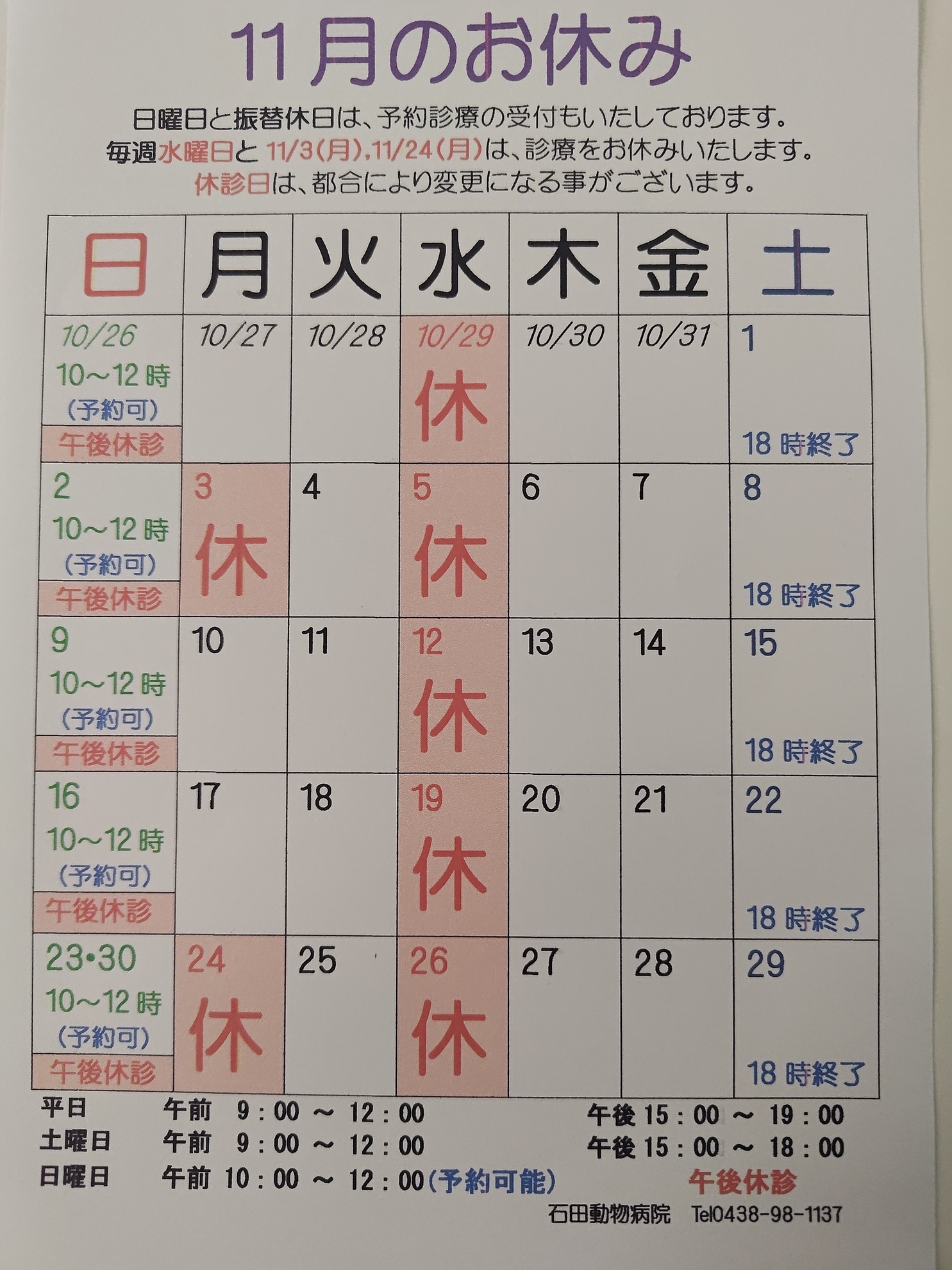11月は毎週水曜日及び3日(月)がスポーツの日、24日(月)が勤労感謝の日の振り替え休日となり病院はお休みいただいております。
