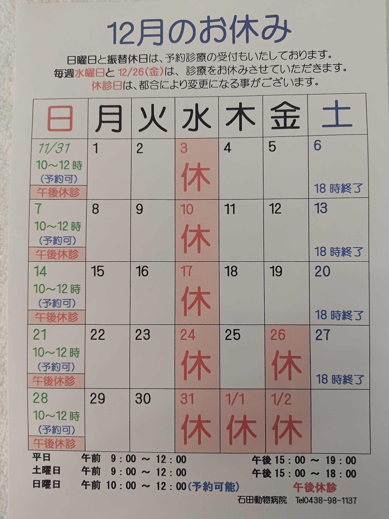 12月の診察予定日は毎週水曜日と、26日(金)が獣医師の津堂によりお休みをいただきます。